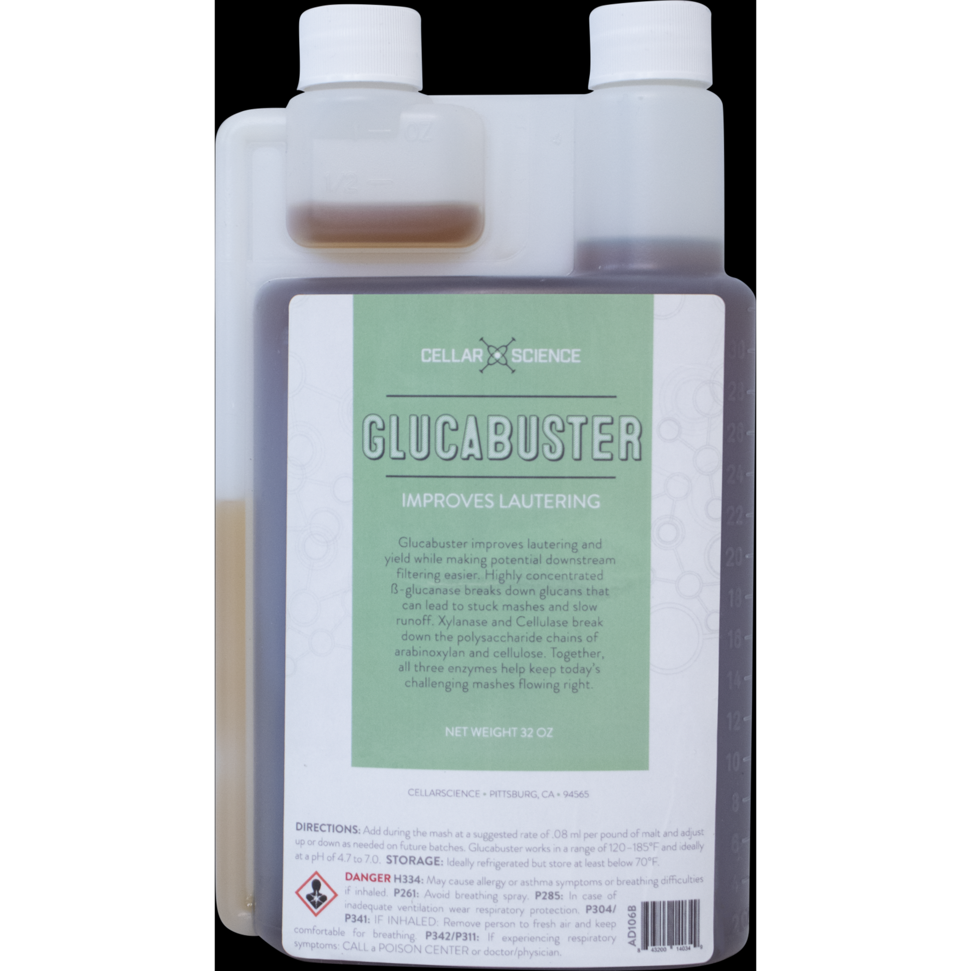 CellarScience Glucabuster improves lautering and yield and makes any downstream filtering easier. First the highly concentrated β-glucanase break down the glucan formation that can lead to stuck mashes and slow run off. Then the included Xylanase and Cellulase break down the polysaccharide chains of arabinoxylan and cellulose. Together, all three enzymes help keep todays challenging mashes flowing right.